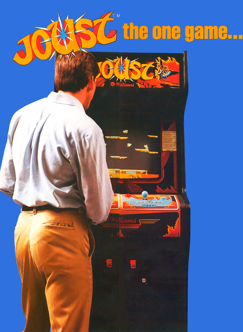 Joust is a platform-based action combat game for one or two-players (with the two-player game offering either team-up OR head-to-head combat; the first time arcade gamers were given this choice) in which each player controls a knight riding on the back of a flying ostrich. The object of the game is to progress through platform-based levels by defeating groups of buzzard-riding enemy knights. This is achieved by 'jousting'; both enemy and player knights carry a lance and must fly around the level (actioned by repeatedly hitting the 'Flap' button) trying to oust rival knights from their steeds by ramming them with the lance. This can only be achieved if the attacking rider is above the enemy knight when the lance connects. A collision of equal elevations results in the two knights bouncing off each other, but if a player is lower than their enemy at the instant of contact, they themselves will be knocked from their steed and lose a life. A defeated enemy will turn into an egg that falls to the bottom of the screen. This must be quickly collected by players as if the egg lands on a platform and isn't retrieved in time, it will eventually hatch into another enemy knight that must be defeated again. Joust features three different types of enemy knights - Bounder, Hunter, and Shadow Lord - with each earning players different points values when defeated. A pterodactyl will appear after a predetermined time to hunt the players. Accurately navigating the player Knights can be initially quite difficult as control is strongly affected by both gravity and inertia. Players can lose a life by either being knocked from their steed by an enemy knight, or by falling into the lava pit at the bottom of each level.