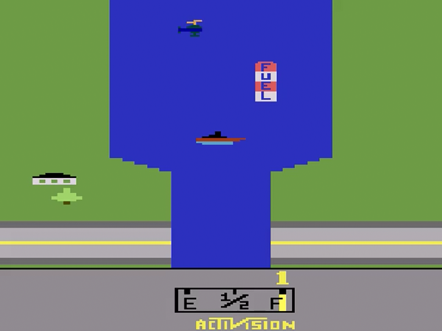 River Raid is a vertically scrolling action game. You fly a jet up a river in an attempt to destroy bridges which are vital to the enemy. The river is heavily guarded, however, with balloons, ships, choppers, and enemy aircraft trying to stop you. Along the way you will need to fly over fuel stations to refuel your jet and keep flying. The plane is armed with a cannon with unlimited ammo. It can be used to destroy the enemy vehicles and bridges, but a careless player can accidentally destroy a fuel station. Colliding with the riverbanks or with the enemy aircraft destroys your plane and makes you lose a life.