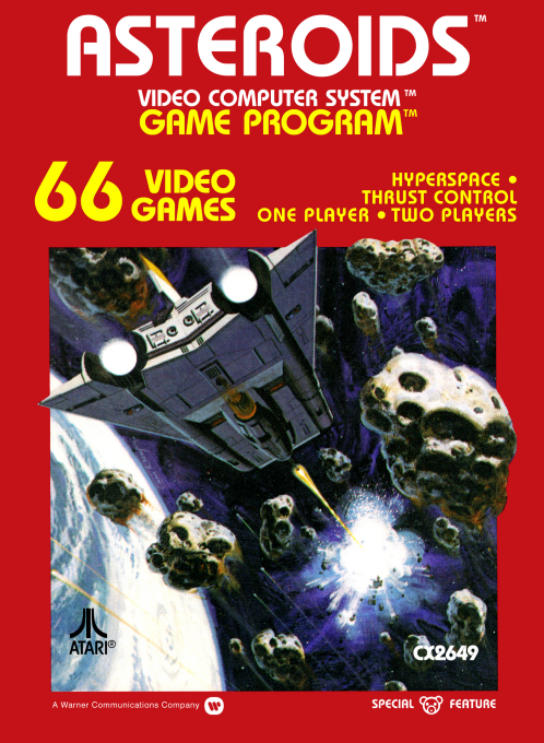 Asteroids is a conversion of the arcade game of the same name. Play the role of a spaceship pilot trapped in a gigantic asteroid cloud and pulverize incoming asteroids with the ship's photon cannon. When all asteroids are destroyed, the play can them move to the next round. In addition to asteroid, the player will also face an Alien Robot Saucer which shoots randomly across the screen. The player using the controller may rotate the ship (left or right) to any direction or move the ship forward. Shots will be fired according to the ship direction. The player has three reserved ships available to replace a destroyed spaceship. The spaceship is destroyed if an asteroid collides with the spaceship or is shot by an Alien Robot Saucer. Additionally, the player may opt to use the hyperspace warp to avoid collision. The warp however, may also destroy the spaceship in the process. Asteroids when shot will break-up into smaller pieces or be destroyed.. There are three types of asteroids: large asteroids, medium asteroids, and small asteroids. Large asteroids and medium asteroids when shot, will break-up into two smaller sized asteroids. Small asteroids when shot will be destroyed. Alien Robot Saucers come in two sizes: small and large. Both use photon lasers to shoot and will explode when destroyed. Alien Robot Saucers will not appear at the Novice Level. Game Difficulty and Variations There are 4 available difficulty settings: Novice, Intermediate, Advanced, and Expert. The game also offers three different game variations: 1. Standard Play - For one or two players, taking turns when a player's ship is destroyed. 2. Competition Asteroids - Two players appear on the screen at the same time. Friendly fire is in affect, which means shots fired from one player's spaceship will destroy the other player's spaceship. Each player has separate ship reserves. 3. Team Asteroids - Two players on the screen at the same time. Friendly fire is disabled, which means shots fired from one player's spaceship will not destroy the other player's spaceship and just pass through. Ship reserves for both players are combined. Scoring The score of the Player 1 is viewable on the upper left side of the screen, while Player 2 on the opposite upper right side. A player will be awarded a new reserve ship for every 10,000 points. 1. Small saucer - 1,000 points 2. Other player's ship - 500 points 3. Large saucer - 200 points 4. Small asteroid - 100 points 5. Medium asteroid - 50 points 6. Large asteroid - 20 points