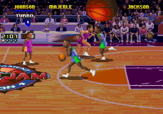 This game lets you play two-on-two arcade basketball with players from all the NBA teams. Gameplay is fast and action-packed, with few rules, no fouls, and deliberately unrealistic slam dunks. Players are rated on eight ability categories, from steals and blocks, to dunks and 3-pointers. Up to four players can take play with AI for missing players. 2v2 and 2v1 are supported. The Tournament Edition ups each team's roster to three players, and allows for substitutions between quarters. Players can now be injured requiring them to be subbed out to let them recover. Aside from the usual secret characters and cheat modes, Tournament Edition also includes "Hot Spots", "Powerups", "Juice Mode" and "Tournament Mode". Winning Tournament Mode also unlocks a higher CPU difficulty level.
