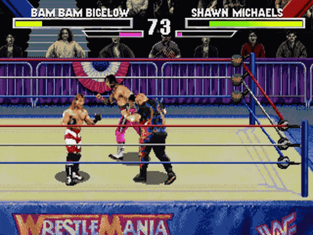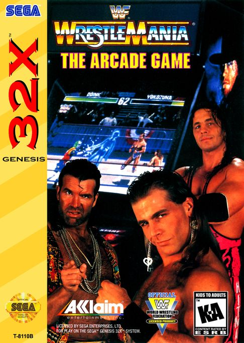 WWF Wrestlemania: The Arcade Game merges the personalities and action of the popular WWF TV show characters with a Mortal Kombat-style fighting game. This title features digitized graphics of 8 WWF superstars: Doink, Razor Ramon, Bret "Hit Man" Hart, Shawn Michaels, The Undertaker, Yokozuna, Bam Bam Bigelow, and Lex Luger. Although it is a wrestling title, this game is structured a lot like a one-on-one fighter. It is very fast-paced, and features crazy special moves. Also, each match is divided into a series of rounds, much like a fighting game. Instead of each round ending in a KO, each round simply ends when you force the other wrestler(s) to fall by reducing their energy meter. Game modes include single player arcade mode, tournament mode, and vs mode for 1-on-1 multiplayer.