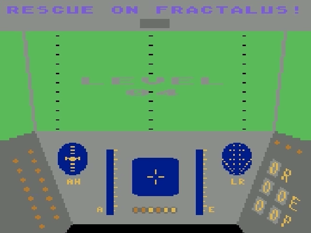 Rescue on Fractalus is an action game played from a 3D first person point of view. Your mission is to rescue stranded pilots on the planet of Fractalus. You begin each mission from the mother ship, and when your quota of pilots has been rescued you must return there so you can move on to the next level. To help locate the pilots and navigate the tricky terrain, your spaceship is equipped with various instruments, such as a compass, altimeter, and scanner. Your enemy, the Jaggi's, have numerous forces on this planet and will be attempting to stop you. Gun emplacements, flying saucers, and the Jaggi themselves are all capable of destroying your ship if you don't destroy them first. To defend yourself from these threats, your ship is equipped with torpedoes. As the levels progress, the Jaggi defenses become more aggressive, and you will even need to fly some night missions where visibility is limited!