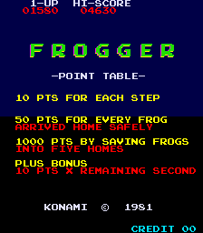 Frogger is a one or two-player game in which players must overcome a number of hazards to safely guide the green amphibian from the bottom of the screen to one of five home bases situated at the top of the screen. A round is completed once five frogs have been guided safely home, after which the next round begins with an increased level of difficulty. This includes faster-moving vehicles on the road section and new, deadly hazards on the river section, including crocodiles, otters and snakes.