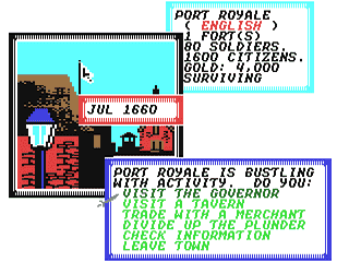 Take on the life of a buccaneer in the golden age of Caribbean Piracy! This game lets you choose from 6 different "ages" (for example, "The Silver Empire" from 1560-1600, "War For Profit" from 1640-1660, etc.), one of 4 nationalities (English, French, Dutch, Spanish), 4 difficulty levels, and one of 5 special abilities (skill at fencing, skill at navigation, etc.). Nine different types of ships were represented. The goal of the game is to retire with as much gold and land as possible, as many ranks/titles as possible (Colonel, Admiral, Marquis, Duke), and a wife. Finding long lost relatives helps too. You accomplish these goals by plundering cities, capturing and sinking enemy ships, getting in good with governors to receive titles, learn news of "evil Spaniards" holding your relatives, capturing evil pirates, etc.