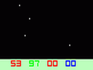 This game cart contains 2 space themed games. In Galactic Space Wars, players take control of a fighter spacecraft to find and destroy enemy spacecrafts. Players take a first person perspective from inside the cockpit of the spacecraft to search the vast area of space. Once an enemy craft is located, players try to quickly scroll the ship into their lasers sight. If the enemy stays on the screen too long, it will fire at the player's ship. The player has a limited amount of time to destroy as many ships as possible and not get hit. Lunar Lander seems to have been inspired by the same titled arcade game. Players pilot a lunar lander and attempt to have a soft landing. The lander only has a certain amount of fuel to maneuver around with thus adding to the challenge. The key is to gently and smoothly lower the lander onto the platform, as coming down too fast or missing the platform crashes the lunar lander. The objective is to land the craft in the least amount of time possible.