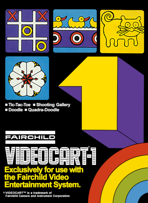 Videocart-1 features 4 different programs. Tic-Tac-Toe. A computerized version of the popular game. You play the X's and the computer the O's; taking turns your goal is the place three X's on the 3x3 grid before the computer. You always get to move first. Shooting Gallery. In this game, for 1 or 2 players, you control a rifle and need to hit a target on the other side of the screen. The goal is to hit the target with as few misses as possible. You can play with or without a time limit and at different speeds. Doodle. This is a drawing program. Using the controller you can draw any picture you like on the screen. There are five different line sizes and three available colors. Quadra-Doodle. Here the computer will draw random patterns influenced by the player, such as changing the colors used and the size of the lines. You can switch back and forth between Quadra-Doodle and Doodle, allowing you to draw on top of the generated image or the computer to draw on top of yours.