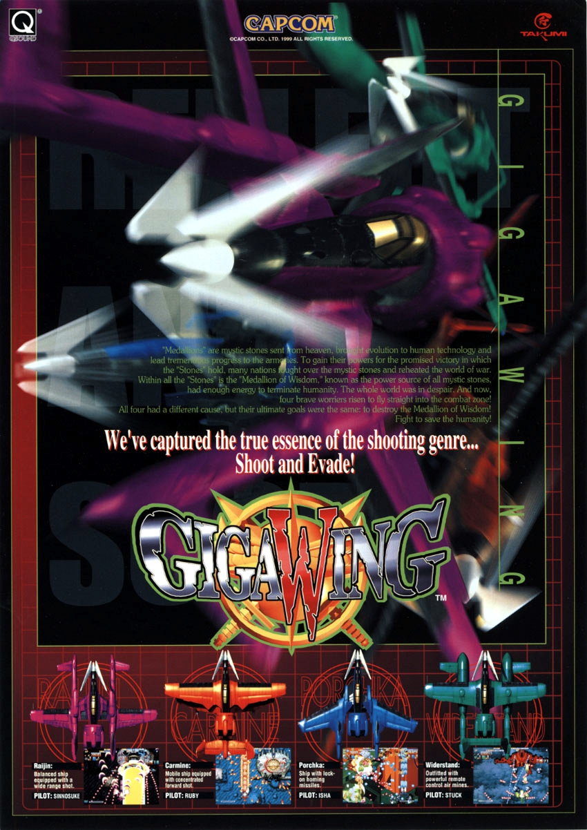 'Medallions' are mystic stones sent from heaven, brought evolution to human technology and lead tremendous progress to the armories. To gain their powers which the 'Stones' hold for the promised victory, many nations fought over the mystic stones and reheated the world of war. Within all the 'Stones' is the 'Medallion of Wisdom', known as the power source of all mystic stones, it had enough energy to terminate humanity. The whole world was in despair. And now, four brave worriers have risen to fly straight into the combat zone! All four had different reasons, but their ultimate goal was the same: to destroy the Medallion of Wisdom! Fight to save the humanity! Giga Wing is a shoot-em-up set during a fictional war. The player controls one of four different futuristic aircraft and must destroy enemy aircraft, tanks, ships, and buildings using both guns and missiles mounted on the aircraft and a limited supply of bombs which damage or destroy all enemies on-screen when used.