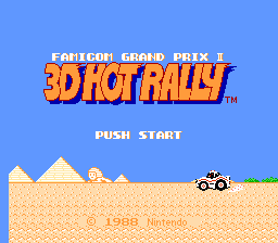The second game in the Famicom Grand Prix series. In a departure from its predecessor, Famicom Grand Prix II features a behind-the-car view similar to Outrun and Rad Racer. Rather than consisting of a handful of short tracks, 3D Hot Rally provides three long tracks consisting of a variety of different terrain types giving the feel of an actual rally race. Each track has multiple routes to the finish line, requiring you to find the best path to victory. The game features three cars to choose from: the speedy Kattobi coupe, the balanced Yonque truck, or the rugged Monster buggy. In order to complete a race, players must reach each checkpoint within a certain time limit. If the limit is crossed too late, time is subtracted from their bank. If the time bank is depleted, the race is over. Successfully reaching a checkpoint before the time limit is reached banks extra time. Players can also collect exclamation marks scattered throughout the tracks. Collecting enough exclamation marks to fill the dash meter allows temporary access to the hot dash, a fifth gear that greatly increases speed. Before each race, you're asked to place a repair point somewhere on the track, allowing you to repair any damage done to your car, so long as you pick a route that leads you past that checkpoint. Taking too much damage puts you out of the race. As the name implies, 3D Hot Rally allows you to use the Famicom 3D System glasses to give the race a real feeling of depth. It also challenged players to submit their best times via Famicom Disk Fax kiosks located in various stores for a chance to win a Disk-kun stationary set.