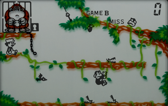 Game & Watch Wide Screen: Donkey Kong Jr. is the first game in the fifth series of Game & Watch games published by Nintendo, also known as the (New) Wide Screen Series, consisting of 8 titles. More colorful and child-friendly, the models from the New Wide Screen series (still described as Wide Screen on the boxes) aren't much different from the previous line of G&W games, save for a cheaper price and a different shell design. Donkey Kong Jr. is a semi-direct port from the Famicom game Donkey Kong Jr. and can be classified as the direct sequel to Donkey Kong 2 from the Multi Screen series. Mario who once again has come back to capture Donkey Kong and put him in a cage. The player controls Junior who has to set his father free. In order to succeed, one must control Junior by jumping and climbing vines and disarm traps by falling coconuts, whilst avoiding crows. The ultimate goal is to secure a key to open the lock on the cage. Game A and B only differ by the time Junior can stay hanging on a vine. By pressing Game A and Game B simultaneously the best score will appear on the screen. This function will be featured in almost every G&W game from then on. This model is also the G&W game with the most buttons (10), including Alarm and ACL.