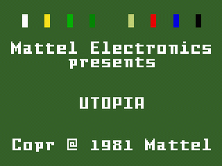 Utopia is a game played by two players on two continents. Players must build their island nation by building farms, housing, schools, hospitals, and factories and making other improvements while also competing against another player. Players are able to sabotage the other player as well, but they must also handle maintaining a fleet of PT boats to protect their fishing fleet, building forts to prevent rebellion, and dealing with the occasional hurricane. The game is played in real time. Each player moves a box shaped cursor around the screen to perform construction and moving of boats.