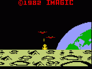 Eerie creatures launch an assault against Moon Station Tranquillity. Use your Laser Cannon to blast them - or they'll devastate Earth! Waves of demons circle the lunar surface, bombarding Earth's last outpost. Resist their dive bombing blitz. Fire into their ranks and shatter their raid. Then go on the offensive! Take off from the surface of the moon and combat the demon base. Eliminate the flickering shield. Repel the suicide patrollers that come hurtling your way. Place one shot directly through the revolving window and into the fiery core. The demon base will disintegrate. But the battle goes on!