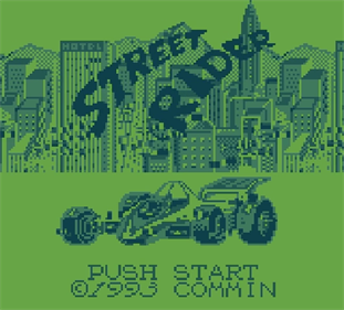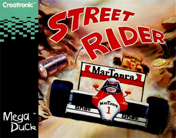 Street Rider is a clone of the 1980 racing game Midway Rally-X, but much slower, with the visibility problems inherent in Mega Duck. Imagine Pac-Man with racing cars, spread across a vast scrolling map and with increasingly rare collectibles. Your task is to steer the car through the maze and collect them without hitting enemy cars. As in Pac-Man, your sprite moves continuously in the last direction the player pressed, but instead of stopping on the walls, your car bounces off them and continues in the opposite direction. It is not possible to destroy enemy cars, you can simply slow them down.