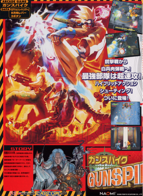 Cannon Spike (Gunspike in Japan) is an overhead-camera shooting game in the vein of Smash TV and another Capcom creation, the Commando series. Released for the arcades, and later for the Sega Dreamcast. in 2000, Cannon Spike is a linear game, heavily focused towards boss encounters. A main feature of the game is the ability to play as a number of familiar Capcom characters from other franchises.
