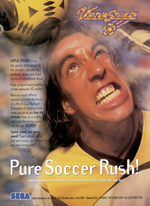 Virtua Striker is the first three-dimensional computer graphic soccer gameby Sega, bringing extreme competition to the arcades. State of the art texture mapping provides sophisticated reproduction of the World Cup atmosphere, with incredibly immersive game action and realistic backgrounds. It uses the same architecture as Virtua Fighter 2.