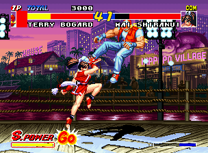 The fourth title of fighting Fatal Fury series. Now, you can destroy fight scene objects and the "Fatal Fury 2" fighters are back forming this list: Terry Bogard, Andy Bogard, Joe Higashi, Franco Bash, Mai Shiranui, Bob Wilson, Geese Howard, Billy Kane, Hon-Fu, Ryuji Yamazaki, Sokaku Mochizuki, Blue Mary, Kim Kaphwan, Jin Chonrei, Jin Chonshu and Duck King.