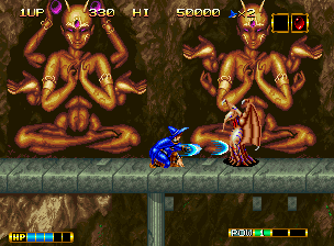 Magician Lord puts you in charge of Elta, a wizard who has the task of collecting eight books of wisdom from the clutches of Az Atorse, the god of destruction. By collecting the right power-ups along the way, you can transform into different characters, including the Rajin, Samurai, Waterman, Shinobi, Poseidon, and Dragon Warrior. Each character has different abilities. There are eight areas in the game, and each stage ends with you trying to defeat both a guardian and the end-of-area boss (which are basically Atorse's incarnations). One of the first games that demonstrated the graphical abilities of the Neo-Geo.