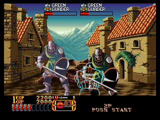 Crossed Swords II features the same gameplay from its predecessor (Crossed Swords on Neo Geo MVS and AES). The player is given a first-person view with a third-person silhouette/wire-frame view of the character similar to the Punch-Out!! arcade game. New to this sequel is the addition of a new button for jumping and dashing, giving the player more maneuverability and allowing him to dodge incoming attacks. By pressing the attack button after dashing the player will make a horizontal slash which stuns enemies briefly, and by pressing the attack button after jumping the player will make a powerful downward slash.