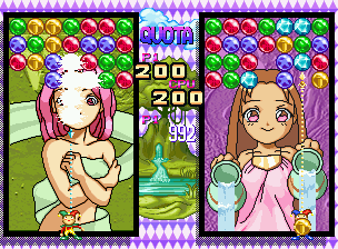 In Magical Drop II, you control a clown that can grab and throw balloons. You have to match three balloons of the same colour or more vertically to pop them and clear the screen. You can hold multiple balloons of the same colour at once and cause consecutive collisions. There are special balloons that cannot be removed that easily and power-ups that clear entire rows or provide additional help. Depending of the originating country, there are different game modes: 1. Survival: Play as long as you can - an endless flow of balloons appears at a rapidly increasing speed while you move up levels. 2. Puzzle: You have a limited time to clear a fixed set of balloons before time runs out. 3. VS Mode: Fight the CPU or a fellow player in a direct split-screen duel. Each character has specific item balloons during gameplay.