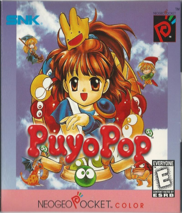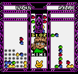 The object of this head-to-head puzzle game is to clear your grid of falling patterns called puyos by forming chains of four or more same-colored puyos in a straight line or one of several geometric patterns. What makes this a challenging two-player contest is the fact that when you clear a chain of puyos from your grid, it drops a random piece of filler onto your opponent's grid. The more puyos you clear, the more you fill your opponent's grid, and if you can clutter up his grid enough to fill it to the top, you've won the game.