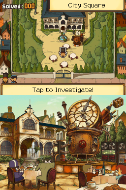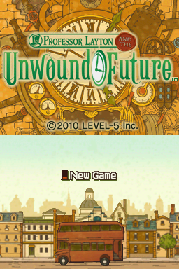 Professor Layton and his assistant Luke attend the unveiling of a new invention called a time machine. The Prime Minister of London is volunteered as a test subject, but the machine explodes and there is no trace of him. With the Prime Minister missing, London is in chaos! Shortly after these events, the puzzle-solving pair receive a letter, which has apparently been sent by Luke's future self, stating that London is in serious trouble. The Professor and Luke follow the directions in the letter, which leads them to their most exciting adventure yet... Professor Layton and the Unwound Future is the third installment in the Professor Layton series. As with the previous games in the series, players explore game scenes by tapping on areas of interest with the stylus. Doing so can cause Layton and Luke to examine objects, talk to characters, finding hint coins (which can be spent on hints for difficult puzzles) and most importantly, discover puzzles that can be solved. Puzzles range from math, to logic, to riddles to sliding block puzzles, as well as many more different types. There are also "secret" areas in scenes which, when tapped, may leave a puff of dust or a rustle of leaves. Repeatedly tapping on these areas reveals a hidden secret, such as a bonus hint coin, or even a hidden, more difficult puzzle. New to Unwound Future is the addition of the 'Super Hint'. While as with the previous games, you can spend a hint coin to unlock up to three hints, there is also another option. Once these three hints have been exhausted, for the price of two hint coins, you can unlock a more detailed 'Super Hint' as a last resort. There are also three new minigames incorporated into the game. In the Picture Book game, you must place the correct stickers in the right spots to make a story that makes sense. In the Toy Car game, you must place tiles which navigate a toy car around the board, collect all the objects, and then reach the goal. Finally, in the Parrot game, you must tie ropes onto pegs to help your parrot deliver parcels to people who have requested them.
