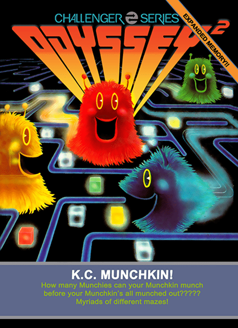 K.C. Munchkin is a blue furry antennaed critter who's hungry for Munchies that float around in a maze. However, there are three antennaed Munchers who are hungry for K.C., so K.C. must avoid running into them unless he eats the special blinking Munchies that give him power to eat the Munchers. Once K.C. eats all the Munchies, he enters a new maze where the Munchies (and the Munchers) get faster. The player can select from several different mazes, including ones that turn invisible when K.C. moves around, and can even edit mazes.