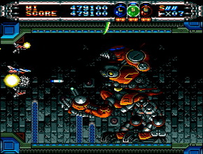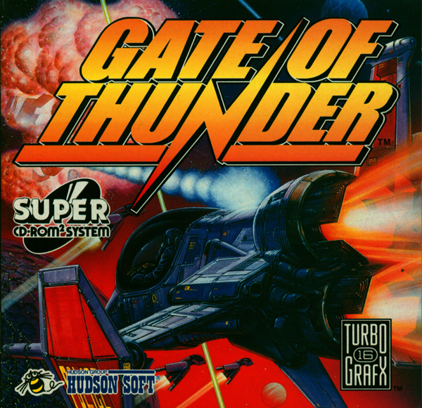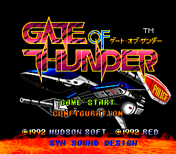 A side-scrolling shoot-'em-up, Gate of Thunder asks players to take control of the space-craft "Hunting Dog". Playing as the pilot Hawk, along with Esty in her ship the "Wild Cat", you must defeat the forces of General Don Jingi, who has plans of taking energy from the star of Aries. Gate of Thunder allows players to choose in real-time from three weapon-fire types. A blue-coloured electrical fire, a green-coloured wave-fire, and a red-coloured quake-type fire. Along with this, players obtain homing-missiles and the assistance of the "Wild Cat" which orbits the ship separately.
