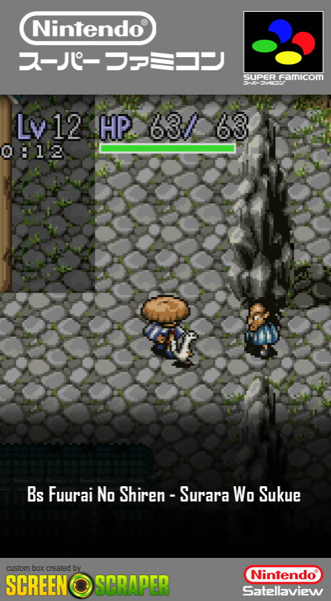 BS Furai no Shiren: Surara wo Sukue is a Downloadable 4-part Soundlink game for the Satellaview that was broadcast in at least 3 runs between April 28, 1996 and August 2, 1997. The gameplay is substantially similar to the earlier roguelike, Fushigi no Dungeon 2: Furai no Shiren, a game released for the SFC on December 1, 1995 and subsequently localized for English markets in March 2008 as Mystery Dungeon: Shiren the Wanderer for the Nintendo DS. It also bears similarities to other Mystery Dungeon games including Dragon Quest Yangus, The Nightmare of Druaga, and Pokemon Mystery Dungeon. Like other Mystery Dungeon games, it is set in a fantasy land based on feudal Japan, and it falls into the roguelike genre. The titular hero of the game, Shiren the Wanderer, moves in a turn-based fashion through a series of maps filled with monsters, traps, and items. The maps, referred to as dungeons, take a variety of forms including traditional dungeons, caves, forests, etc. When a player is slain, he begins at the start again with stats at the base level, however he can regain items that had previously been stored a warehouse.