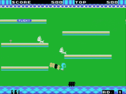 Little baby birds, PIOPIOes, are seen basking on the bright sunny terrace. It's now time for the little PIOPIOes to take their midafternoon snack. FLICKY, your mother, is coming to take all of you back home. Let's return skipping merrily hand in hand with mama FLICKY. Oh, oh, we've got a big problem!! The ill-natured stray cat (NYANNYAN) is coming. Escape by jumping over him and throwing hammers and mugs in an effort to hit and destroy the big bad cat. FLICKY, you'll feel really relieved when you have successfully taken all of your baby PIOPIOes back home, won't you?