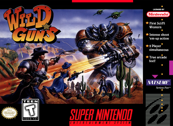Annie & Clint, two gunslingers, arrive at Carson City and get caught up in a gunfight. It's raining bullets and there are explosions everywhere. After an intense battle they enter the saloon where they dispose of every cowboy in sight while redecorating the interior. Our heroes flee the scene by climbing on the roof, but what's that sound? ... it's a HUGE robot! Wild Guns is a shooter with a western & Sci Fi theme. Gameplay is somewhat similar to the Time Crisis & House of the Dead games, with the exception that the game isn't played from a first-person perspective but from a third-person perspective. You control your on-screen character as well as the aiming crosshair. Select either Clint or Annie and shoot down tons of enemies while dodging bullets and jumping over incoming rockets. After the Carson City level, the action continues in Desolation Canyon, an ammunition depot, a gold mine and a armored train . Finally there's a showdown with the big bad guy.