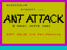 An early isometric game that predates Ultimate's classic Knight Lore by a year. Used what it called the "softsolid 3d" algorithm to represent a large scrolling city from a switchable isometric perspective. The city, identified in the inlay blurb as Antescher, a combination of Ant and Escher, the famous visual paradox artist, is teeming with deadly giant ants. The player controls a boy or a girl and races around the city trying to find his/her lost half while jumping on structures to avoid the ants, or fighting the insects by either jumping on them or throwing grenades. Ant Attack, like most games of its time, was created almost solely by a single programmer, who also designed the graphics and sound. This game had a unique visual appeal in a time before isometric action-adventures became all the rage.