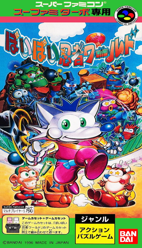 Poi Poi Ninja World is a Bomberman-like multiplayer game in which players try to do in their opponents by tossing bombs, rocks, and other objects. Poi Poi Ninja World could be linked with other Poi Poi Ninja World carts inserted into the second slot of the Sufami Turbo, allowing the exchange of various save data.