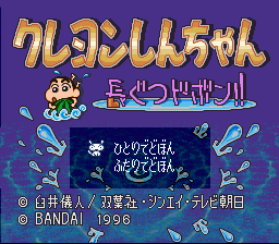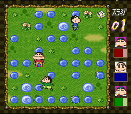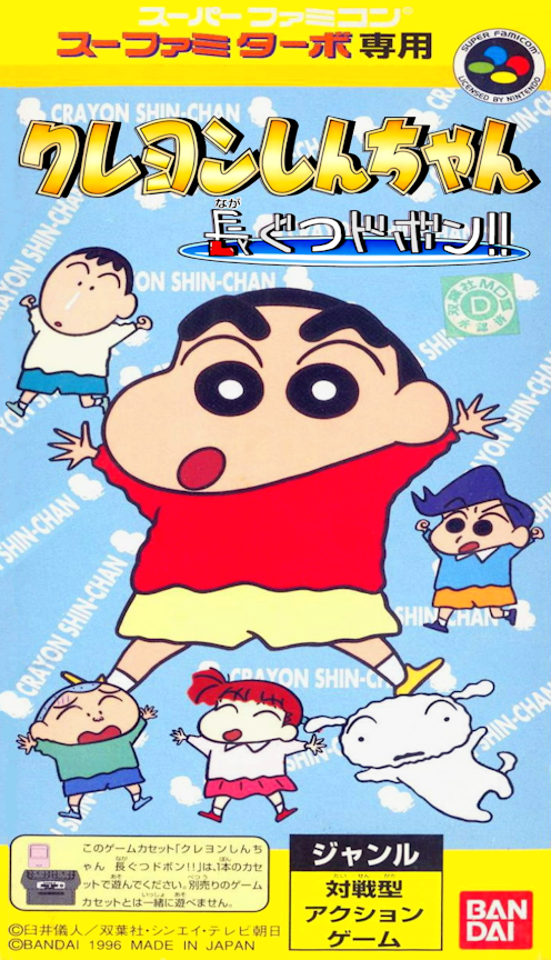 Crayon Shin-Chan: Nagagutsu Dobon! ("Crayon Shin-Chan: Galoshes Splash!!") is an action game. It is based on the anime Crayon Shin-Chan. The goal of the game is to make puddles splash and soak the opponents. The puddles have their own specificities depending on their size. Taking advantage of their layout is the key to getting the opponents to get wet. There are also bonuses that the player can collect during the game.