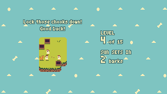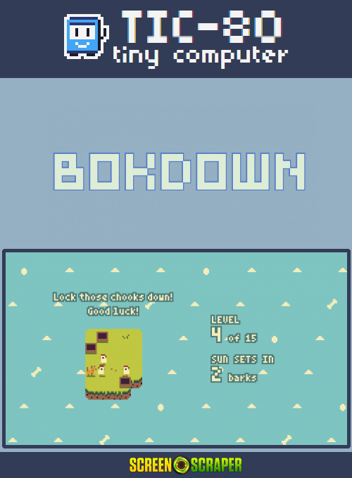 Boz the Dog's master has forgotten to lock down the chooks! Sunset is fast approaching and the foxes are hungry. Lock down those chooks before sunset by barking them into their coops! This was an entry to an itch.io game jam with the theme "Lockdown."