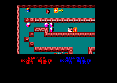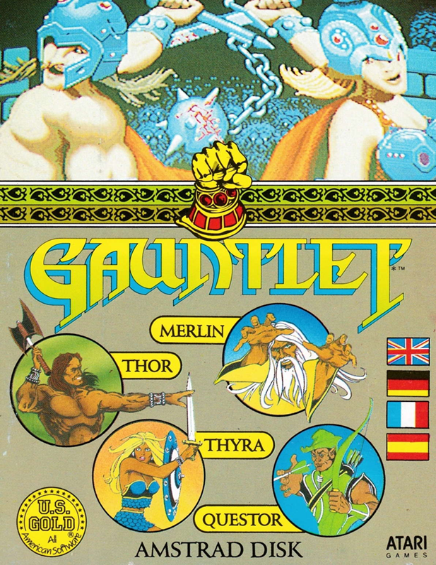 Gauntlet, the original arcade smash hit, is a fighting game where you choose a character and let rip into the hordes of enemies that assault you on you way to the end of the level. One or two players must make their way through 100 levels of mayhem and magic. It featured a choice of four characters to play with, each with different weapons. Thor the Warrior, has a bludgeoning battle axe, Thyra the Valkyrie, has a close range sword, Questor the Elf has his long range bow, and Merlin the Wizard has magical bolts. Ghosts, goblins and even the life draining Death are your enemies. Enemies stream out of generators, so destroy these before tackling the rest. Keys are needed to open the many doors within the levels, and in some situations a door will contain only bonus items, not a progressive route. Scattered magic potions act like smart bombs and clear the screen of all enemies. Beware of poison though, this reduces your energy level. Treasure is abundant throughout the levels and adds to your score.