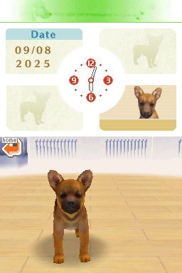Nintendogs lets you take care of virtual pets (dogs, obviously) on your Nintendo DS. You can train your puppies by speaking commands into the microphone, pat the pooch with the stylus, play games like as "fetch" with a Frisbee, buy toys, food, and accessories, and take part in competitions to win trophies. If there are other Nintendo DS users with Nintendogs nearby with both of you in "Bark Mode", you can link the games wirelessly and see both dogs on the same screen. You initially only have 6 (US/EU), 5 (JP) of the 18 (US/EU), 15 (JP) breeds available when you start playing the game (the six breeds being determined by which version of the game you buy), but as you progress, you unlock more breeds and items to buy. If you connect with another user that has another breed of dog not available to you then their dog's breed will be unlocked for you. The available versions to purchase are: Japanese Versions: 1. Chihuahua & Friends: Beagle, Cavalier King Charles Spaniel, Chihuahua, Labrador Retriever, Shih Tzu. 2. Miniature Dachshund & Friends: German Shepherd, Miniature Dachshund, Miniature Schnauzer, Pug, Yorkshire Terrier. 3. Shiba & Friends: Miniature Pinscher, Pembroke Welsh Corgi, Shetland Sheepdog, Shiba Inu, Toy Poodle. North American and European Versions: 1. Chihuahua & Friends: Boxer, Cavalier King Charles Spaniel, Chihuahua, German Shepherd, Shetland Sheepdog, Yorkshire Terrier. 4. Dachshund & Friends: Beagle, Golden Retriever, Miniature Dachshund, Pug, Shih Tzu, Siberian Husky. 5. Lab & Friends: Labrador Retriever, Miniature Pinscher, Miniature Schnauzer, Pembroke Welsh Corgi, Shiba Inu, Toy Poodle. 6. Best Friends Version (North America - bundled with DS): Beagle, German Shepherd, Golden Retriever, Labrador Retriever, Miniature Dachshund, Yorkshire Terrier. 7. Dalmatian & Friends: Dalmatian, Boxer, German Shepherd, Golden Retriever, Yorkshire Terrier, Beagle. In addition to all the breeds listed above, there are two more breeds that can be unlocked through various ways.