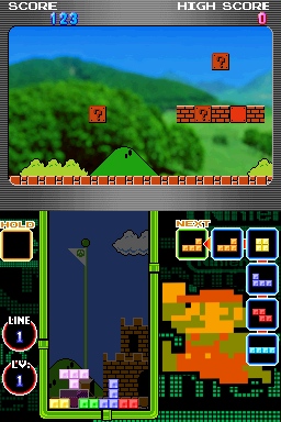 At its base, Tetris DS is the same Tetris gameplay that's been around for years: rotate and arrange Tetriminos to create full lines and make them disappear. However, it also has a style very different from earlier Tetris games, new play modes, and online play. Graphically and aurally, Tetris DS is based on classic NES games. A portion of the graphics are sprites directly ripped from Mario Bros., Super Mario Bros., Super Mario Bros. 3, Donkey Kong, Balloon Fight, Metroid, Yoshi's Cookie, and The Legend of Zelda. Remixes of music from these games are also used. Standard mode includes the standard endless play option, the standard "get 25 lines to win" option, and the standard versus mode where clearing multiple lines at once adds lines to the bottom of your opponents' well. Push mode is a versus game with a twist. The player's moves and pieces are shown on the top screen, while the opponent's are on the bottom screen, both with gravity moving towards the center. Instead of multiple line clears adding extra lines to the bottom of your opponent's well, though, the center is pushed towards their end, giving them a smaller play area. Push back and forth until one side loses. Touch mode presents you with a tall uneven stack of large Tetriminos. The goal is to nudge or rotate them by dragging or tapping on the touch screen to create full lines and eventually clear the stack. Puzzle mode offers 200 Tetris scenarios and presents you with a number of pieces. You choose the order and rotation of the pieces to try and empty the well. Mission mode gives you specific goals like "Use a square block to clear a line" or "Clear 3 lines with an L piece". Finish the mission and you'll be given another. Don't finish the mission and several rows of random blocks will be added to the bottom of the well before being given another mission. Catch mode has the Tetriminos falling without direct player control. Instead, the player controls a moving core of blocks which can rotate as a whole, as well as latch on to the falling Tetriminos. The goal is to create a square of at least 4x4, causing an explosion which keeps the size of your core small. Lose by allowing your core to get too large, or by losing enough energy; which occurs when you allow a Tetrimino to scroll past the bottom of the screen, your rotating core smacks into and destroys a Tetrimino, or you hit a falling enemy. Multiplayer Standard, Mission, and Push modes can be played locally using one copy of Tetris DS. Mission allows for up to 10 players competing for a high score. Standard allows for up to 10 players, and has an option for Mario Kart-like items to aid you or harm your enemies. Push mode remains a one-on-one experience. With Nintendo Wi-Fi Connection, you can play a two-player Standard game without items, a four-player Standard game with items, or a two-player Push mode game.