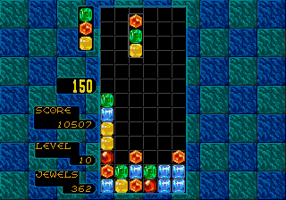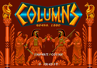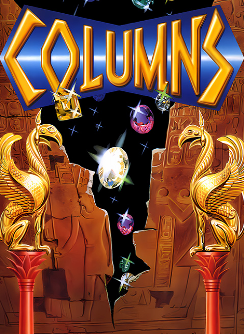 Columns is a Tetris-style puzzle game in which you stack falling jewels in order to created a chain of three of the same colored jewel.