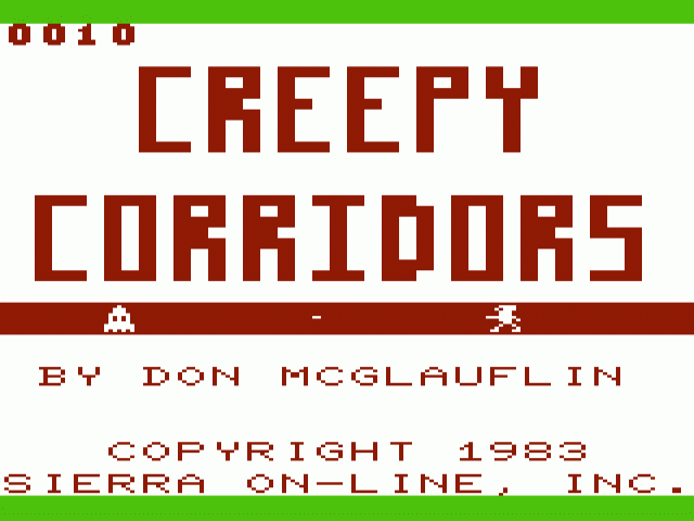Creepy Corridors is a maze game similar to Wizard of Wor, adventurer Sierra Smith has entered the catacombs of Creepy Corridors in search for treasures. The mazes are full of riches but there are also lots of creatures that will do all they can to protect it. That's not enough to stop this adventurer though and it's up to the player to help him out. Each level consists of four diamonds that the player has to pick up. At the same time he has to avoid getting killed by the monsters that wander around the corridors. To his help he has a gun that he can use to shoot the creatures as they get close. Once all the diamonds have been picked up, an exit will open up that takes the player to the next level. The exit will also open when the player has killed all the monsters before collecting the diamonds. The player has four lives at the start of the game and each time he collects all the diamonds of a level he earns an extra one. More and tougher enemies are encountered as the player progresses through the levels.