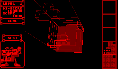 3D Tetris is a 3D Tetris game on Virtual Boy with 3 modes. The first contains five layers of Tetris blocks. Each time you complete a layer the blocks fall, disappear and you'll be rewarded with points. In the second, you place the blocks around the center of a well, the aim being to make them disappear. In the third mode, a form will be posted before the start of the match. You will have to reproduce that form perfectly.